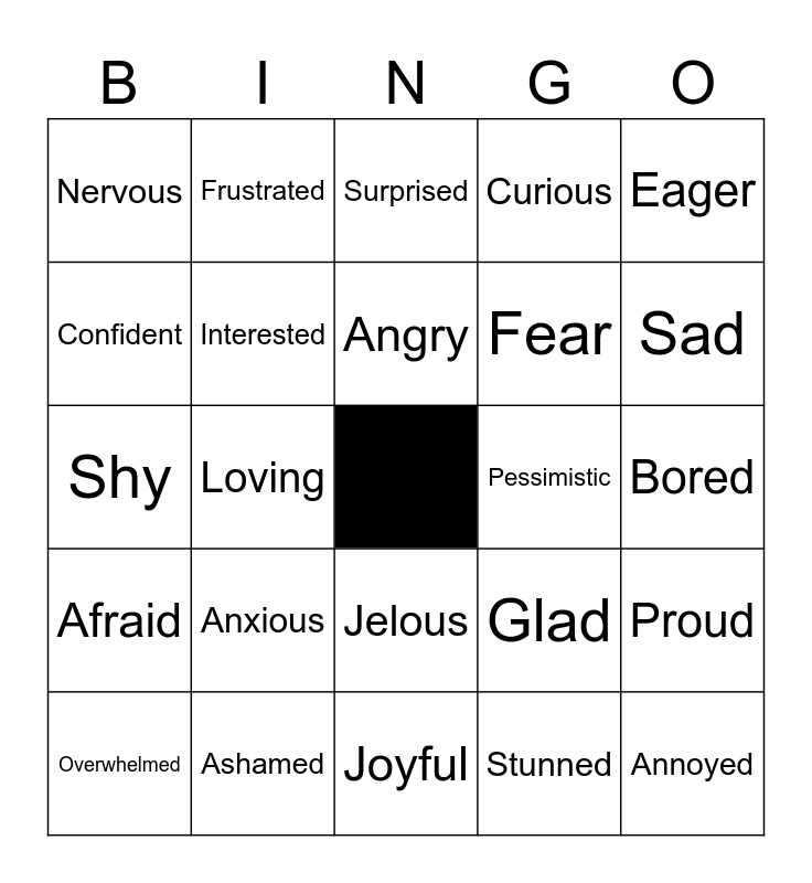 This bingo card has a free space and 24 words: Anxious, Ashamed, Angry, Overwhelmed, Eager, Nervous, Confident, Frustrated, Pessimistic, Jelous, Fear, Shy, Glad, Proud, Interested, Stunned, Bored, Surprised, Sad, Loving, Annoyed, Afraid, Curious and Joyful.