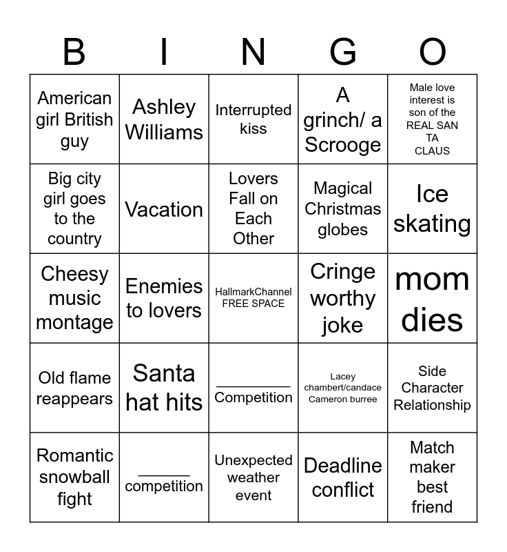 This bingo card has a free space and 63 words: Special Ornament, Nostalgic Story, City Ex BF, Side Character Relationship, Small Village with Colorful Buildings, Friendly Sheriff, Ashley Williams, Little Rat Dog/Crusty Dog, Lovers Fall on Each Other, Match Maker Best Friend, _________ Competition, Someone Wears Apron, mom dies, Male love interest is son of the REAL SANTA CLAUS, meets prince, Big city girl goes to the country, Enemies to lovers, American girl British guy, Time travel/ ghost, Magical Christmas globes, Santa hat hits, Old flame reappears, A grinch/ a Scrooge, Airport scene, “Oh you have a little something”, Snotty niece turns good, Mistletoe scene, Snowfall scene, Failing family business, Live Christmas music, Tree lighting, Someone’s stranded, Scarfs on screen, Hot cocoa, Ice skating, Romantic snowball fight, Car troubles, Deadline conflict, Gazebo, Vacation, Cheesy music montage, Cringe worthy joke, Little rat dog/ crusty dog, Lovers fall on each other, Match maker best friend, ______ competition, Someone wears apron, Lacey chambert/candace Cameron burree, Walking down the street and everyone knows their name, Horse, Character abandons family business, Unexpected weather event, Romantic misunderstanding, Fairy god mother type character, Punchable child, Interrupted kiss, Special ornament, Nostalgic story, City Ex BF, Side character relationship, Small village with colorful buildings, Friendly sheriff and Ashley Williams.