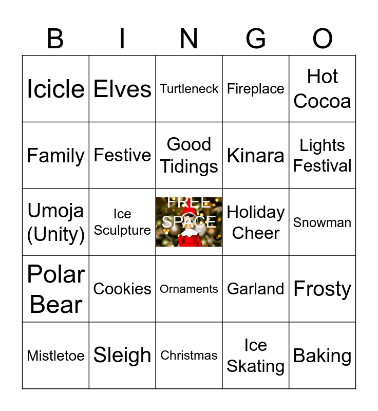 This bingo card has a free space and 48 words: 3, 2, 1, Happy 2025!, Baking, Candles, Christmas, Cookies, December, Elves, Evergreen, Family, Feast, Festive, Fireplace, Frosty, Garland, Gingerbread, Hanukkah, Good Tidings, Holiday Cheer, Holiday Music, Hot Cocoa, Ice Sculpture, Ice Skating, Icicle, Kinara, Kwanzaa, Lights Festival, Mistletoe, Mittens, Ornaments, Polar Bear, Presents, Reindeer, Scarf, Sled, Sleigh, Snowball, Snowflake, Snowman, Snowstorm, Solstice, Stockings, Tinsel, Turtleneck, Twinkle Lights, Umoja (Unity), Winter Wonderland, Wreath and Yule Log.