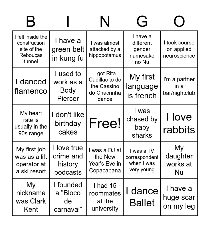 This bingo card has a free space and 33 words: I have been an airplane accident specialist, Despite having a driver's license, I don't drive, I don't like birthday cakes, I was almost deported once, My first job was as a lift operator at a ski resort, I used to work as a Body Piercer, I took course on applied neuroscience, My nickname was Clark Kent, I have a green belt in kung fu, I have been to Everest, I got Rita Cadillac to do the Cassino do Chacrinha dance, I was almost attacked by a hippopotamus, I was born in a farm in Goiás without electricity, I always said I would never work for a bank, I was chased by baby sharks, I'm a partner in a bar/nightclub, I founded a "Bloco de carnaval”, My heart rate is usually in the 90s range, I love true crime and history podcasts, I was a TV correspondent when I was very young, I was a DJ at the New Year's Eve in Copacabana, I personally met Bono and U2 band, I fell inside the construction site of the Rebouças tunnel, I love rabbits, I had 15 roommates at the university, I have a huge scar on my leg, I have a different gender namesake no Nu, My first language is french, I danced flamenco, My daughter works at Nu, I wrote a book, I dance Ballet and I have o.
