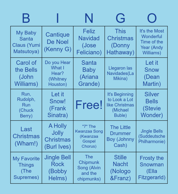 This bingo card has a free space and 70 words: Joy to the World (Rodaviva Ensemble), Silver Bells (Stevie Wonder), All I want for Christmas Is you (Mariah Carey, Rockin' Around The Christmas Tree (Brenda Lee), Jingle Bell Rock (Bobby Helms), Merry Christmas Everyone (Shakin' Stevens), This Christmas (Donny Hathaway), Felice natale (Al Bano Carrisi), It's the Most Wonderful Time of the Year (Andy Williams), Jul, jul stralande jul (Jacobs Kammarkor), Jingle Bells (Suddeutsche Philharmonie), Star Ng Pasko(Auza Seguerra), My Baby Santa Claus (Yumi Matsutoya), Feliz Navidad (Jose Feliciano), Hanukkah Candles (Kenny Ellis), Let it Snow! (Frank Sinatra), "7" The Kwanzaa Song (Kwanzaa Gospel Chorus), Llegaron las Navidades(La Mikina), Run Rudolph Run (Chuck Berry), Last Christmas (Wham!), It's Beginning to Look a Lot like Christmas (Michael Buble), The Little Drummer Boy (Johnny Cash), Let it Snow (Dean Martin), You're a Mean One, Mr. Grinch (Tyler the Creator), Rudolph the Red Nosed Reindeer (Dean Martin), Oh Hanukkah (Jack Black), Jingle Bells (Minions), Kala Chashma (Amar Arshi), Stille Nacht (Nologo &Franz), Te Deseo Muy Felices Fiestas (Luis Miguel), Cantique De Noel (Kenny G), Pyaar Hota Kayi Baar Hai (Awaara), Holly Jolly Christmas (Dolly Parton), Soulful Christmas (James Brown), Let it Snow (Boyz II Men), Rudolph the Red Nosed Reindeer (Temptations), Santa Clause is Coming to Town (Jackson 5), The Christmas Song (Nat King Cole), Winterzyt, Wiehnachtszyt (Peter and Nina Reber), Carol of the Bells (John Williams), I saw mommy kissing Santa Claus (Jackson 5), A Holly Jolly Christmas (Burl Ives), Frosty the Snowman (Ella Fitzgerarld), Deck the Halls (Nat King Cole), Someday at Christmas (Stevie Wonder), Do you Hear What I Hear? (Whitney Houston), My Favorite Things (The Supremes), What Christmas Means to Me (Stevie Wonder), You're a mean one Mr. Grinch ( Thurl Ravenscroft), Grandma Got Run Over by a Reindeer (Elmo & Patsy), Mele Kalikimaka (Bing Crosby), Christmas Rappin' (Kurtis Blow), Rudolph The Red Nosed Reindeer (DMX), (There's No Place Like) Home for Holidays (Ryan Ahlwardt), The Chipmunk Song (Alvin and the chipmunks), Dominick the Donkey (Lou Monte), Santa Baby (Ariana Grande), 8 Days of Christmas (Destiny's Child), Hope from KWANGYA (SMTOWN), Feliz Navidad (Jose Feliciano), Run, Rudolph, Run (Chuck Berry), Aires De Navidad (Hector Lavoe, Willie Colon, Yomo Toro), Please Come Home for Christmas (Jon Bon Jovi), Xmas Time of the Year (Green Day), December in China (Yang Qin), Petit Papa Noel (Patrick Bruel), Coventry Carol (Pentatonix), Alle Jahre Wieder (Mozart Boys Choir Vienna), Laylet Eid (Fairuz) and The Chanukah Song (Adam Sandler).