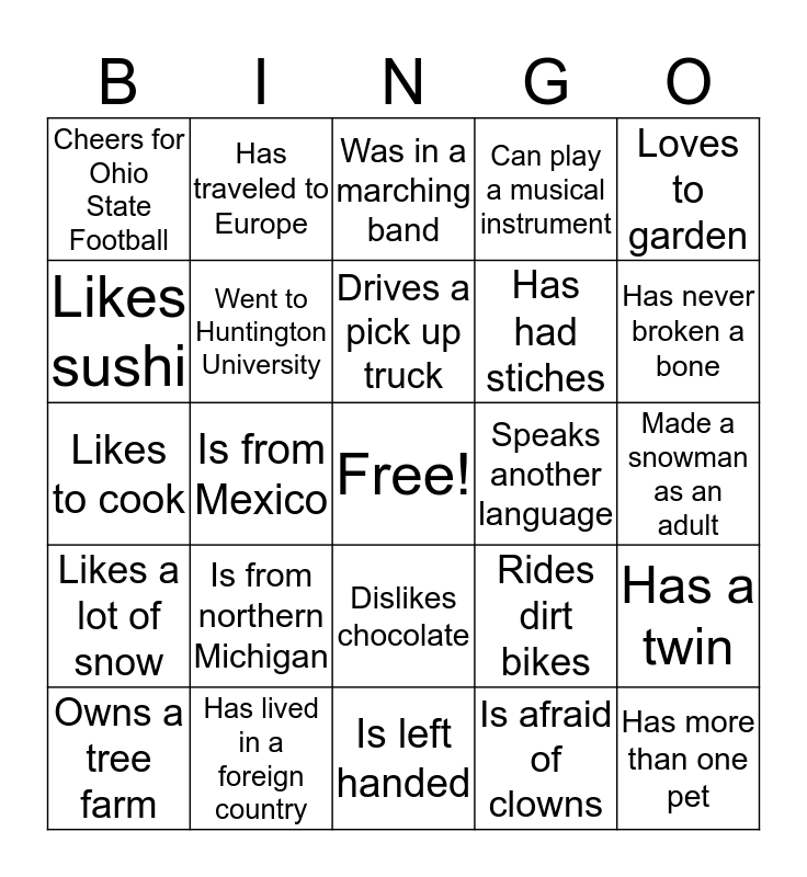 This bingo card has a free space and 24 words: Is from northern Michigan, Has lived in a foreign country, Drives a pick up truck, Owns a tree farm, Loves to garden, Cheers for Ohio State Football, Likes sushi, Has traveled to Europe, Speaks another language, Dislikes chocolate, Has had stiches, Likes to cook, Rides dirt bikes, Has a twin, Went to Huntington University, Is afraid of clowns, Made a snowman as an adult, Was in a marching band, Has never broken a bone, Is from Mexico, Has more than one pet, Likes a lot of snow, Can play a musical instrument and Is left handed.