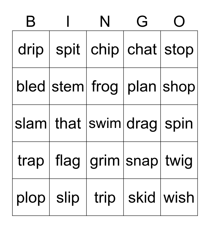 This bingo card has a free space and 24 words: flag, slip, frog, plop, stop, drip, bled, spit, drag, grim, plan, slam, snap, twig, stem, skid, spin, chip, shop, that, wish, trap, chat and trip.