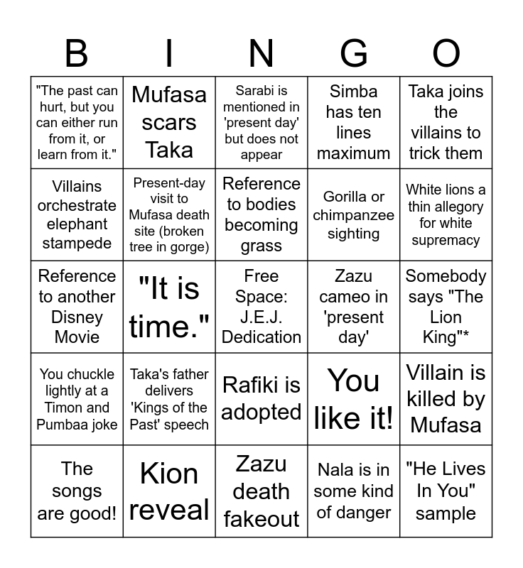 This bingo card has a free space and 24 words: Taka's father delivers 'Kings of the Past' speech, Kion reveal, Reference to bodies becoming grass, The songs are good!, Taka joins the villains to trick them, "The past can hurt, but you can either run from it, or learn from it.", Villains orchestrate elephant stampede, Mufasa scars Taka, Zazu cameo in 'present day', Rafiki is adopted, Gorilla or chimpanzee sighting, Reference to another Disney Movie, You like it!, Villain is killed by Mufasa, Present-day visit to Mufasa death site (broken tree in gorge), Nala is in some kind of danger, Somebody says "The Lion King"*, Sarabi is mentioned in 'present day' but does not appear, White lions a thin allegory for white supremacy, "It is time.", "He Lives In You" sample, You chuckle lightly at a Timon and Pumbaa joke, Simba has ten lines maximum and Zazu death fakeout.