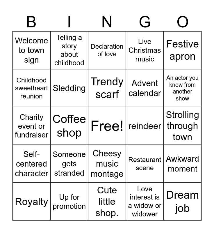 This bingo card has a free space and 49 words: Kids need help with something, Grandparent sighting, Sentimental gift, Love interest is a widow or widower, Strolling through town, Children in Christmas costumes, Telling a story about childhood, Reading a Christmas story, Advent calendar, Completely decked out Christmas Decorations, Childhood sweetheart reunion, Coffee shop, Restaurant scene, Dream job, Family business, Town in Jeopardy, Declaration of love, reindeer, Meddling friend or relative, Welcome to town sign, Up for promotion, Cute little shop., Live Christmas music, Festive apron, Random cute guy, Someone gets stranded, Trendy scarf, an argument, Awkward moment, Self-centered character, Love triangle, Cheesy music montage, Snowfalls at the right moment, Someone has sworn off love, Royalty, Special family tradition, Beautifully wrapped gifts, Big city boyfriend or girlfriend shows up, An actor you know from another show, Wish comes true, Christmas Eve deadline, Couple falls in love, Tree market, Cozy fire, Charity event or fundraiser, Sledding, Snow falling, Matching pajamas and Town event issue.