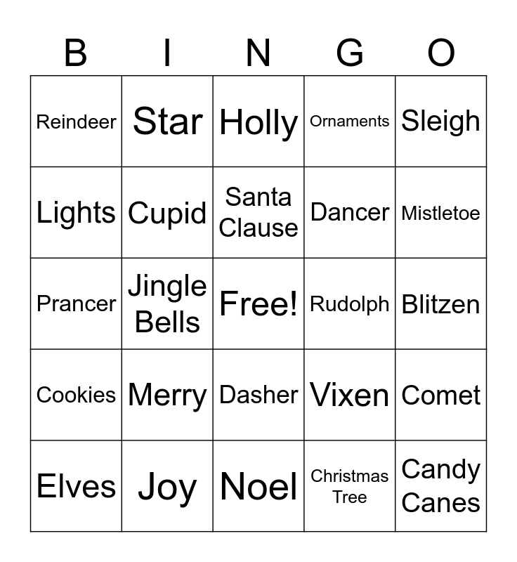 This bingo card has a free space and 25 words: Merry, Noel, Santa Clause, Elves, Sleigh, Reindeer, Lights, Star, Rudolph, Dasher, Dancer, Prancer, Vixen, Comet, Cupid, Donner, Blitzen, Holly, Mistletoe, Jingle Bells, Candy Canes, Joy, Cookies, Ornaments and Christmas Tree.