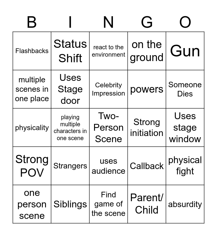 This bingo card has a free space and 34 words: An Argument, Parent/ Child, Magic, Is Driving, Strong POV, Uses Stage door, Gun, one person scene, Status Shift, Unusual name, Celebrity Impression, react to the environment, Uses chair, No, Strong initiation, Someone Dies, Siblings, physicality, Strangers, Callback, uses audience, grounded scene, Flashbacks, Uses stage window, Find game of the scene, absurdity, on the ground, question, powers, multiple scenes in one place, break something, playing multiple characters in one scene, physical fight and co-workers.