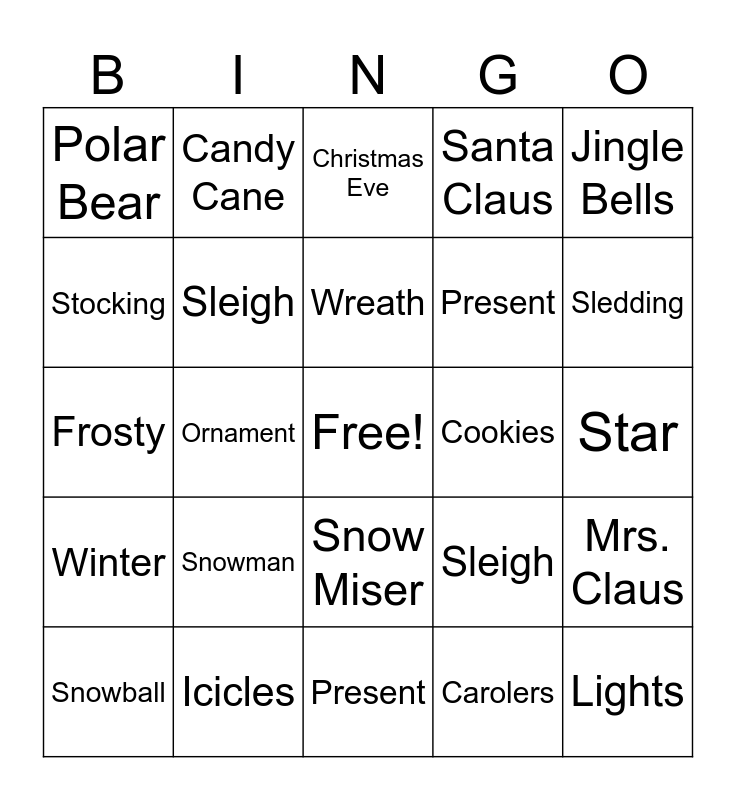This bingo card has a free space and 49 words: Tree, Lights, Rudolph, Present, Snowman, Reindeer, Candy Cane, Snowflake, Stocking, Elf, Sleigh, Santa Claus, Mrs. Claus, Sleigh, Gingerbread, Mistletoe, Wreath, Cookies, North Pole, Jingle Bells, Ornament, Carolers, Polar Bear, Present, Fireplace, Sledding, Snowball, Heat Miser, Snow Miser, Winter, December, Tinsel, Nutcracker, Pinecone, Icicles, Yule Log, The Grinch, Angel, Star, Holly, Snow Globe, Home Alone, The Polar Express, A Christmas Story, Frosty, Christmas Eve, A Christmas Carol, Toys and Jack Frost.