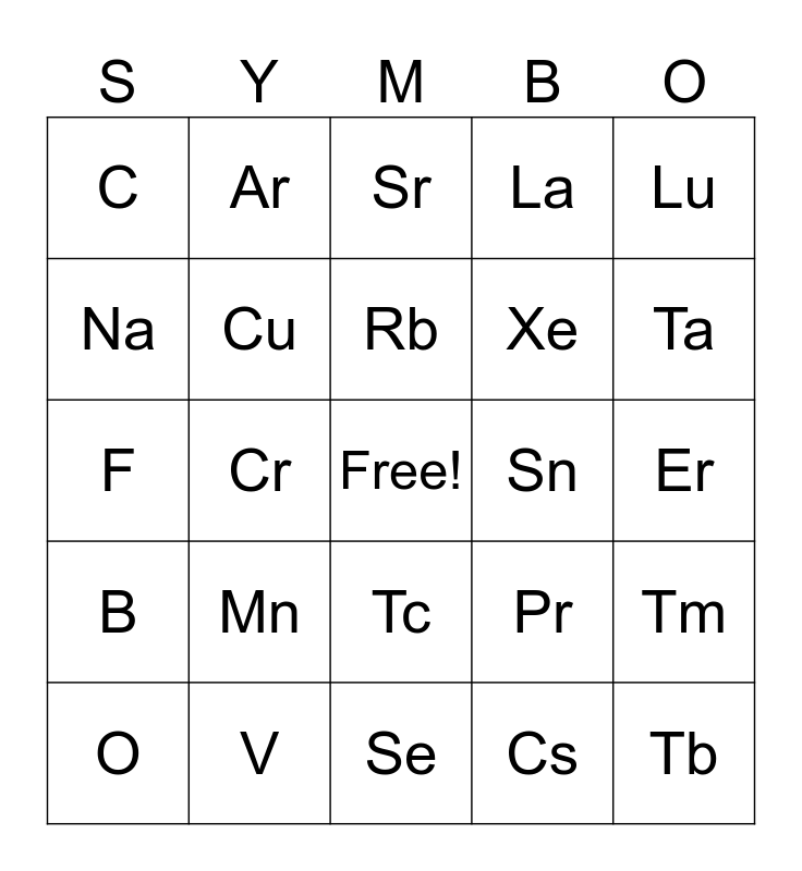 This bingo card has a free space and 75 words: P, Fe, Sr, Nd, Re, Si, Co, Y, Cs, W, Al, Ni, Sn, Ta, Mg, Cu, Zr, Pr, Hf, Na, Zn, Rb, Xe, Lu, C, Ca, Kr, In, Yb, N, K, Mo, Ce, Tm, F, Ar, As, I, Er, O, Cl, Sr, Cd, Ho, Ne, S, Tc, La, Dy, H, Sc, Se, Re, Pm, He, Ti, Y, Ag, Sm, Li, V, Ru, Ba, Eu, Be, Cr, Br, Sb, Gd, B, Mn, Zr, Pd, Tb and Rh.