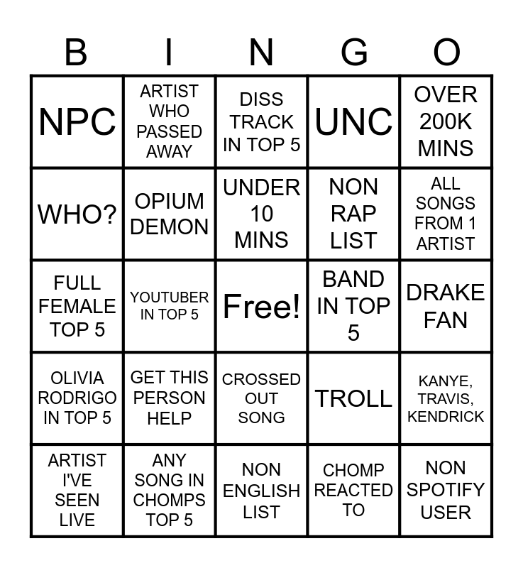 This bingo card has a free space and 24 words: GET THIS PERSON HELP, ANY SONG IN CHOMPS TOP 5, UNDER 10 MINS, ARTIST I'VE SEEN LIVE, OVER 200K MINS, NPC, WHO?, ARTIST WHO PASSED AWAY, BAND IN TOP 5, CROSSED OUT SONG, NON RAP LIST, FULL FEMALE TOP 5, TROLL, KANYE, TRAVIS, KENDRICK, OPIUM DEMON, CHOMP REACTED TO, DRAKE FAN, DISS TRACK IN TOP 5, ALL SONGS FROM 1 ARTIST, YOUTUBER IN TOP 5, NON SPOTIFY USER, OLIVIA RODRIGO IN TOP 5, UNC and NON ENGLISH LIST.