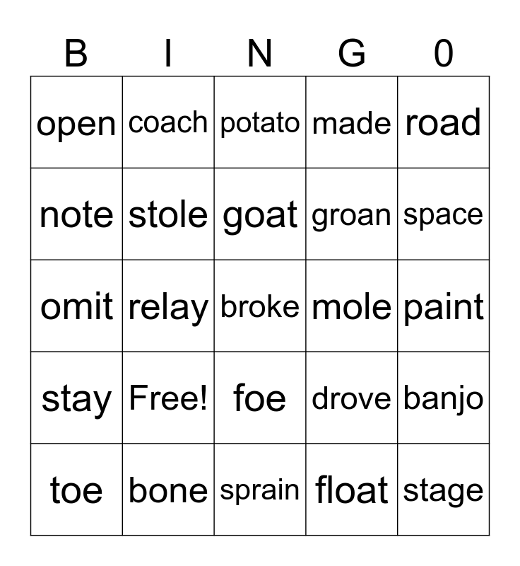 This bingo card has a free space and 24 words: Free!, bone, goat, toe, road, open, note, coach, mole, foe, groan, omit, drove, banjo, stole, float, paint, potato, space, relay, stage, stay, made and sprain.