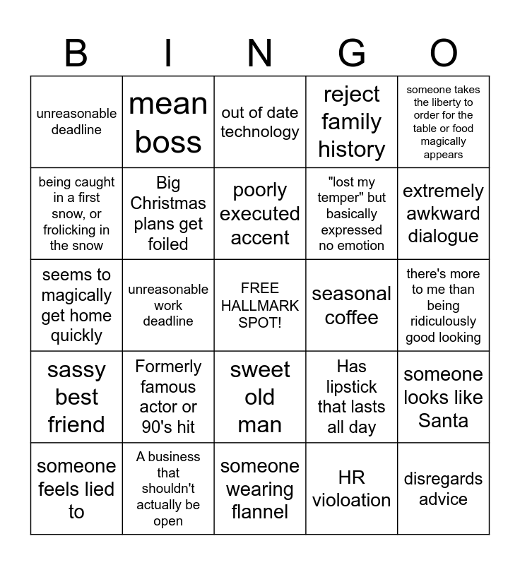 This bingo card has a free space and 24 words: Formerly famous actor or 90's hit, A business that shouldn't actually be open, poorly executed accent, someone feels lied to, someone takes the liberty to order for the table or food magically appears, unreasonable deadline, being caught in a first snow, or frolicking in the snow, mean boss, seasonal coffee, sweet old man, "lost my temper" but basically expressed no emotion, seems to magically get home quickly, Has lipstick that lasts all day, someone looks like Santa, Big Christmas plans get foiled, HR violoation, there's more to me than being ridiculously good looking, out of date technology, extremely awkward dialogue, unreasonable work deadline, disregards advice, sassy best friend, reject family history and someone wearing flannel.