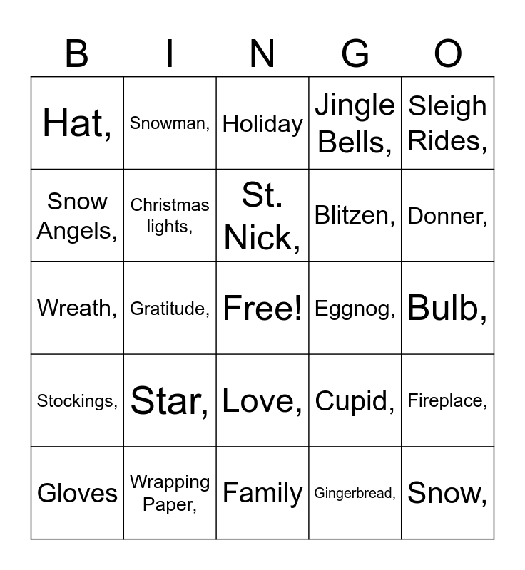 This bingo card has a free space and 77 words: Christmas, Candy Cane, Holiday, Mistletoe, Reindeer, Santa, Silver Bells, Shopping, Holiday cheer, Joy, Elves,, Jolly,, St. Nick,, Snow Angels,, New Years Eve,, Gratitude,, Festive, Snow,, Sleigh,, Sleigh Rides,, Holiday Cheer, Wreath,, Christmas lights,, Snowman,, Jingle Bells,, Snowball Fight,, Rudolph,, Caroling,, Dasher,, Dancer,, Prancer,, Vixen,, Comet,, Cupid,, Donner,, Blitzen,, December,, Tree,, Bulb,, Gingerbread,, Cookies,, Candy,, North Pole,, Ribbon,, Bow,, Turtle Doves,, Gloves, Hat,, Coat,, Icy,, Jesus,, Love,, Hot Chocolate,, Marshmellows,, Feliz Navidad,, Joyful,, Trimmings, Workshop, Presents,, Giving,, Star,, Merry,, Ornament,, Milk,, Bells,, Candle,, Holly,, Eggnog,, Family,, Gifts,, Chestnuts,, Fireplace,, Stockings,, Wrapping Paper,, Snowflake, Family and Decorations.