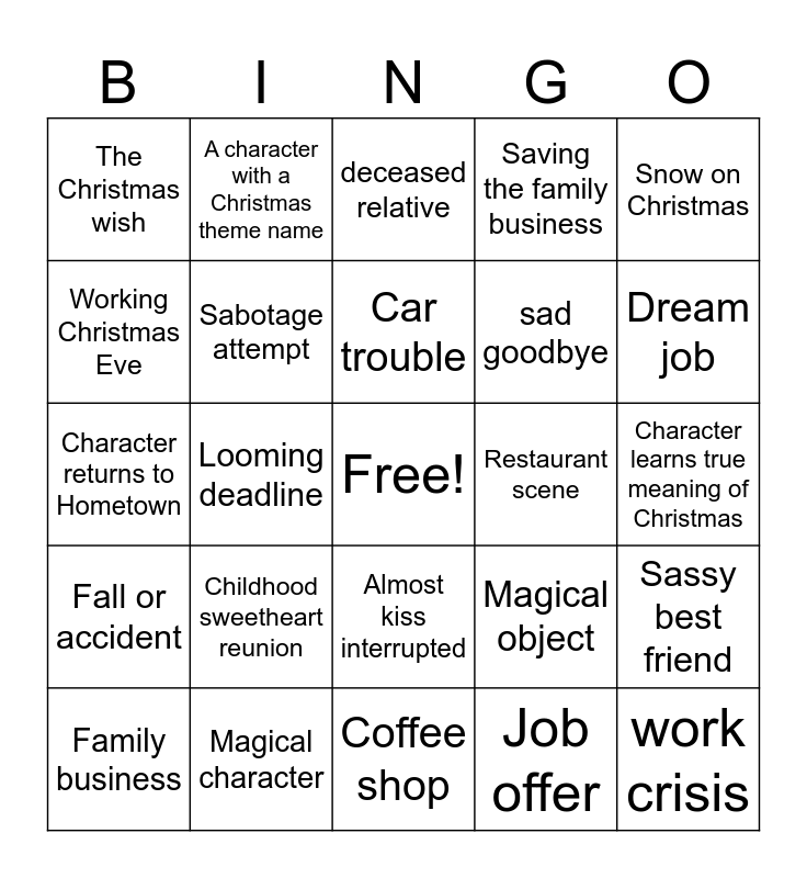 This bingo card has a free space and 26 words: Fall or accident, Magical character, Car trouble, Job offer, Snow on Christmas, The Christmas wish, Sabotage attempt, deceased relative, sad goodbye, work crisis, Working Christmas Eve, Looming deadline, Cozy cabin or lodge scene, Magical object, Character learns true meaning of Christmas, Big misunderstanding, A character with a Christmas theme name, Almost kiss interrupted, Saving the family business, Sassy best friend, Character returns to Hometown, Childhood sweetheart reunion, Coffee shop, Restaurant scene, Dream job and Family business.