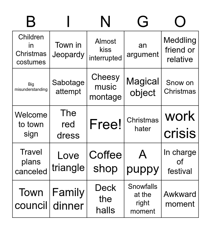 This bingo card has a free space and 87 words: Gift wrapping, Christmas card, Angel, Gingerbread house, Decorating, Elf, Another Hallmark movie preview, Falling in snow, Nutcracker, Stuck in snow, wreath, Pie, Musical instrument, Christmas hater, A single parent, Travel plans canceled, The red dress, Christmas play, Career comes first, Tragic past, Ball or dance, Family dinner, Deck the halls, Blizzard, In charge of festival, Fall or accident, Magical character, Car trouble, Job offer, Mean neighbor, Town council, a look from across the room, Demanding work partner, A puppy, Snow on Christmas, The Christmas wish, Sabotage attempt, deceased relative, sad goodbye, work crisis, Working Christmas Eve, Looming deadline, Cozy cabin or lodge scene, Magical object, Character learns true meaning of Christmas, Big misunderstanding, A character with a Christmas theme name, Almost kiss interrupted, Saving the family business, Sassy best friend, Character returns to Hometown, Childhood sweetheart reunion, Coffee shop, Restaurant scene, Dream job, Family business, Town in Jeopardy, Declaration of love, reindeer, Meddling friend or relative, Welcome to town sign, Up for promotion, Cute little shop., Live Christmas music, Festive apron, Random cute guy, Someone gets stranded, Trendy scarf, an argument, Awkward moment, Self-centered character, Love triangle, Cheesy music montage, Snowfalls at the right moment, Someone has sworn off love, Royalty, Special family tradition, Beautifully wrapped gifts, Big city boyfriend or girlfriend shows up, An actor you know from another show, Kids need help with something, Grandparent sighting, Sentimental gift, Love interest is a widow or widower, Strolling through town, Children in Christmas costumes and Telling a story about childhood.