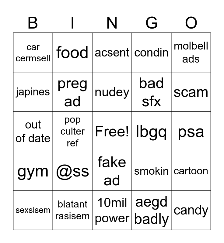 This bingo card has a free space and 24 words: @ss, blatant rasisem, nudey, sexsisem, molbell ads, car cermsell, japines, food, lbgq, fake ad, bad sfx, out of date, smokin, cartoon, preg ad, aegd badly, psa, acsent, scam, pop culter ref, candy, gym, condin and 10mil power.