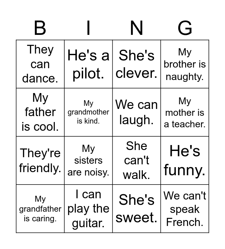 This bingo card has 16 words: I can play the guitar., He's funny., She's clever., They can dance., They're friendly., He's a pilot., She can't walk., She's sweet., My father is cool., My grandmother is kind., My grandfather is caring., My brother is naughty., My sisters are noisy., My mother is a teacher., We can laugh. and We can't speak French..
