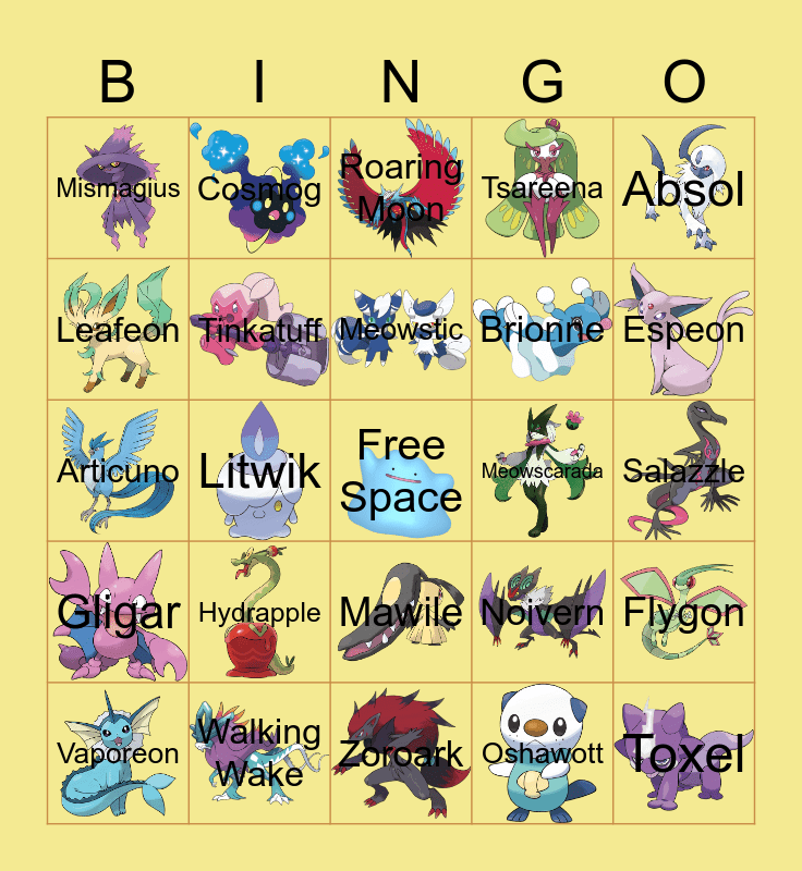 This bingo card has 24 images, a free space and 24 words: Hydrapple, Walking Wake, Meowstic, Vaporeon, Absol, Mismagius, Leafeon, Cosmog, Meowscarada, Mawile, Brionne, Articuno, Noivern, Flygon, Tinkatuff, Oshawott, Salazzle, Roaring Moon, Espeon, Litwik, Toxel, Gligar, Tsareena and Zoroark.