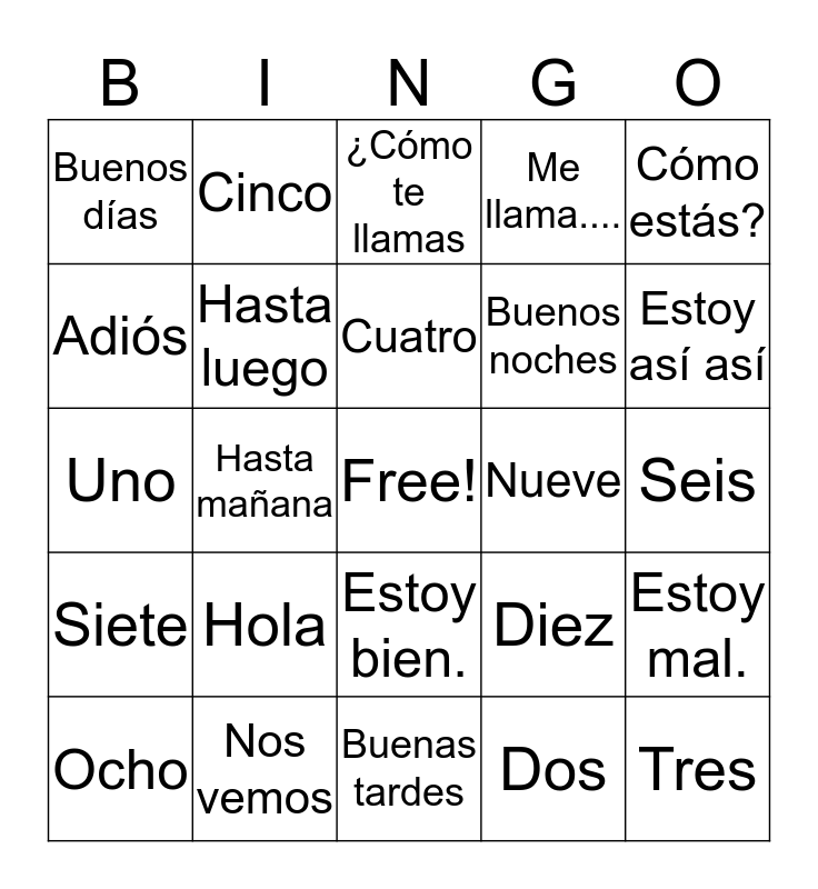 This bingo card has a free space and 24 words: Hola, Nos vemos, Cuatro, Ocho, Cómo estás?, Buenos días, Adiós, Cinco, Nueve, Estoy bien., Buenos noches, Uno, Diez, Estoy mal., Hasta luego, Dos, Seis, ¿Cómo te llamas, Estoy así así, Hasta mañana, Tres, Siete, Me llama.... and Buenas tardes.