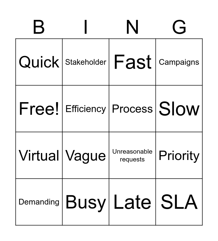 This bingo card has 16 words: Busy, Priority, Fast, Quick, Virtual, Stakeholder, Unreasonable requests, Late, Free!, Efficiency, Demanding, Campaigns, Vague, Slow, Process and SLA.