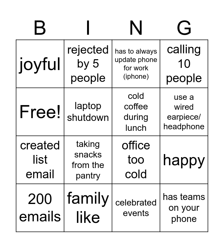 This bingo card has 16 words: family like, happy, has to always update phone for work (iphone), joyful, created list email, rejected by 5 people, office too cold, celebrated events, Free!, laptop shutdown, 200 emails, calling 10 people, taking snacks from the pantry, use a wired earpiece/ headphone, cold coffee during lunch and has teams on your phone.