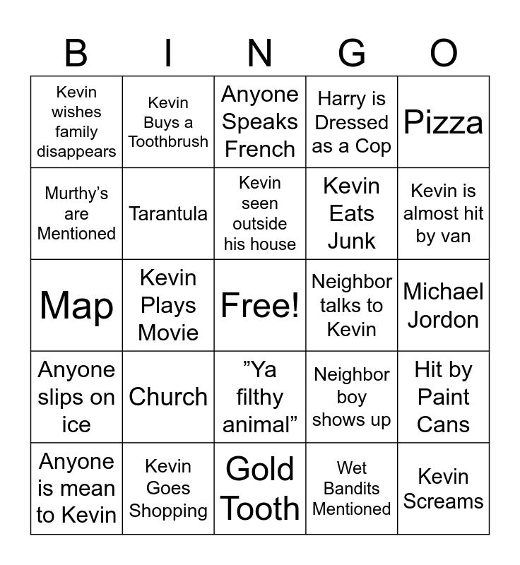 This bingo card has a free space and 29 words: Anyone is mean to Kevin, Statue is Hit, Kevin Plays Movie, Mom Yells “KEVIN!”, Kevin wishes family disappears, Anyone Speaks French, Tarantula, Church, Neighbor talks to Kevin, Kevin Goes Shopping, Michael Jordon, Kevin Screams, Gold Tooth, Wet Bandits Mentioned, Kevin is almost hit by van, Choir Sings, ”Ya filthy animal”, Anyone slips on ice, Pizza, Map, Neighbor boy shows up, Police are seen, Kevin Eats Junk, Murthy’s are Mentioned, Harry is Dressed as a Cop, Kevin Buys a Toothbrush, Hit by Paint Cans, Kevin seen outside his house and Santa Clause.