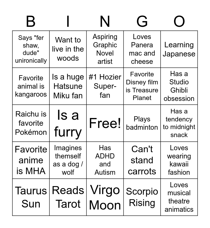 This bingo card has a free space and 24 words: Imagines themself as a dog / wolf, Reads Tarot, #1 Hozier Super-fan, Taurus Sun, Learning Japanese, Says "fer shaw, dude" unironically, Favorite animal is kangaroos, Want to live in the woods, Plays badminton, Has ADHD and Autism, Favorite Disney film is Treasure Planet, Raichu is favorite Pokémon, Can't stand carrots, Loves wearing kawaii fashion, Is a huge Hatsune Miku fan, Scorpio Rising, Has a tendency to midnight snack, Aspiring Graphic Novel artist, Has a Studio Ghibli obsession, Is a furry, Loves musical theatre animatics, Favorite anime is MHA, Loves Panera mac and cheese and Virgo Moon.