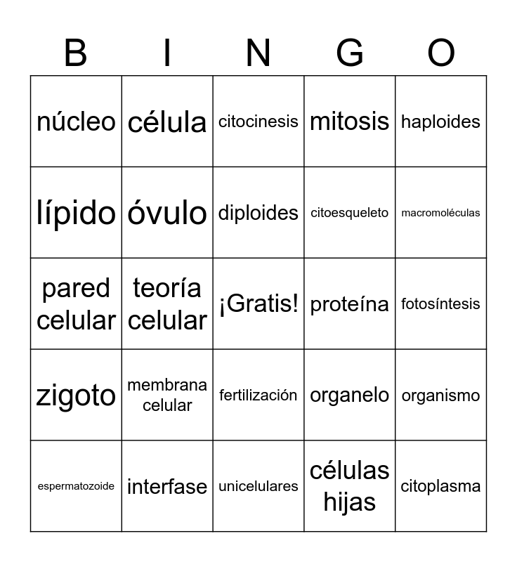 This bingo card has a free space and 39 words: cromátida hermana, meiosis, reproducción sexual, óvulo, espermatozoide, fertilización, diploides, cromosomas homólogos, haploides, zigoto, teoría celular, mitosis, citoplasma, fotosíntesis, proteína, membrana celular, ácido nucleico, núcleo, cloroplastos, organelo, lípido, unicelulares, citoesqueleto, macromoléculas, homeostasis, fermentación, glicolisis, citoplasma, carbohidrato, célula, respiración celular, pluricelular, citocinesis, interfase, células hijas, ciclo celular, organismo, pared celular and centrómero.