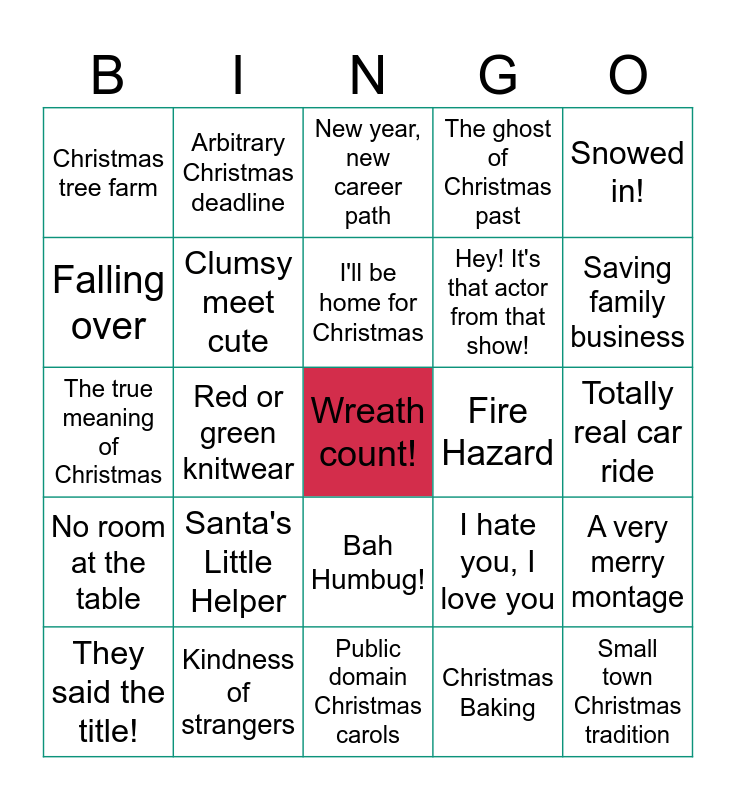 This bingo card has a free space and 24 words: They said the title!, Santa's Little Helper, I'll be home for Christmas, Christmas Baking, Snowed in!, Christmas tree farm, Arbitrary Christmas deadline, New year, new career path, Fire Hazard, Totally real car ride, The true meaning of Christmas, Clumsy meet cute, I hate you, I love you, A very merry montage, Falling over, Kindness of strangers, Public domain Christmas carols, The ghost of Christmas past, Saving family business, No room at the table, Red or green knitwear, Bah Humbug!, Hey! It's that actor from that show! and Small town Christmas tradition.