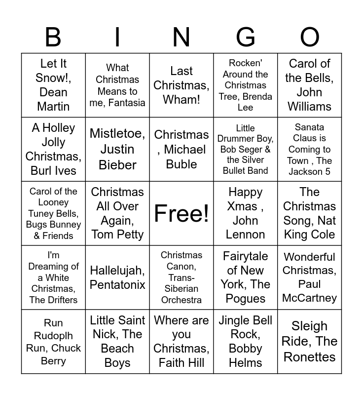 This bingo card has a free space and 37 words: Snowman, Sia, Winter Wonderland, Snoop Dogg, My Facorite Things, Tony Bennett, Mistletoe, Justin Bieber, Wonderful Christmas, Paul McCartney, Hallelujah, Pentatonix, Christmas , Michael Buble, It's the most Wonderful Time of the Year, Andy Williams, Carol of the Bells, John Williams, My Only Wish, Britney Spears, Christmas All Over Again, Tom Petty, Rocken' Around the Christmas Tree, Brenda Lee, Sleigh Ride, The Ronettes, The Christmas Song, Nat King Cole, A Holley Jolly Christmas, Burl Ives, I'm Dreaming of a White Christmas, The Drifters, White Winter Hymnal, Pentatonix, Last Christmas, Wham!, Christmas Canon, Trans-Siberian Orchestra, Happy Xmas , John Lennon, Let It Snow!, Dean Martin, Sanata Claus is Coming to Town , The Jackson 5, Run Rudoplh Run, Chuck Berry, Where are you Christmas, Faith Hill, All I want for Christmas, Mariah Carey, Jingle Bell Rock, Bobby Helms, What Christmas Means to me, Fantasia, Cozy Little Christmas, Katy Perry, Do They Know it's Christmas, Band Aid, I Saw Mommy Kissing Santa Claus, John Mellencamp, Christmas Lights , Coldplay, Little Saint Nick, The Beach Boys, Carol of the Looney Tuney Bells, Bugs Bunney & Friends, I Don’t Know What Christmas Is, Old 97's, Fairytale of New York, The Pogues, Little Drummer Boy, Bob Seger & the Silver Bullet Band and Dancing with my Elf, The Santa Clauses.