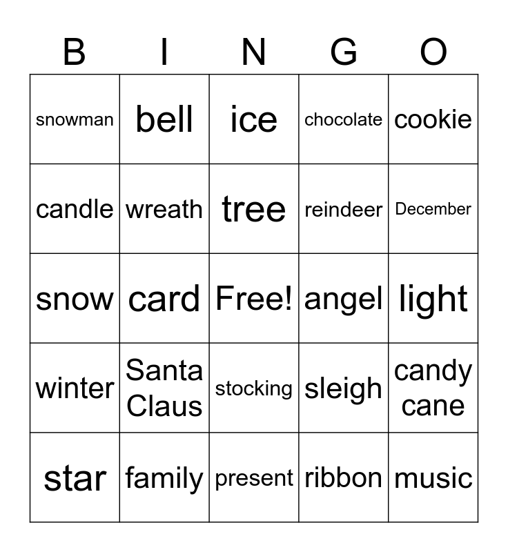 This bingo card has a free space and 25 words: Santa Claus, present, tree, star, cookie, snowman, candle, bell, angel, stocking, reindeer, snow, sleigh, candy cane, wreath, hat, light, ice, December, card, music, family, winter, chocolate and ribbon.