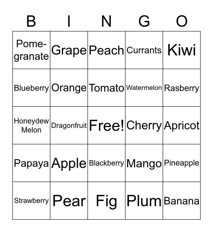 This bingo card has a free space and 24 words: Apple, Pear, Tomato, Strawberry, Kiwi, Pome-granate, Blueberry, Grape, Cherry, Blackberry, Watermelon, Honeydew Melon, Mango, Pineapple, Orange, Plum, Apricot, Peach, Rasberry, Dragonfruit, Banana, Papaya, Currants and Fig.