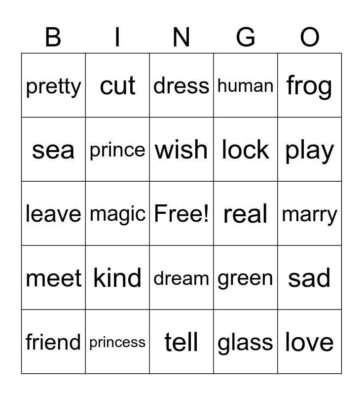 This bingo card has a free space and 40 words: best, leave, queen, prince, princess, dream, wish, kiss, frog, meet, magic, human, love, marry, real, kind, find, pretty, mean, dress, sad, glass, lock, sea, home, ship, hair, climb, light, use, show, friend, king, green, play, tell, want, ready, cut and change.