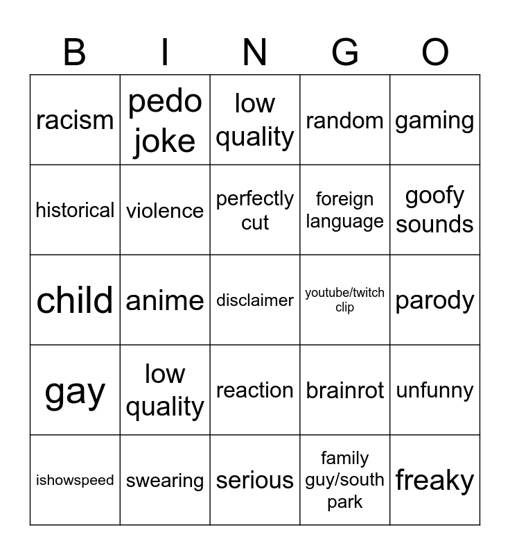 This bingo card has a free space and 24 words: low quality, swearing, perfectly cut, ishowspeed, gaming, racism, historical, pedo joke, youtube/twitch clip, reaction, foreign language, child, brainrot, unfunny, violence, family guy/south park, parody, low quality, goofy sounds, anime, freaky, gay, random and serious.