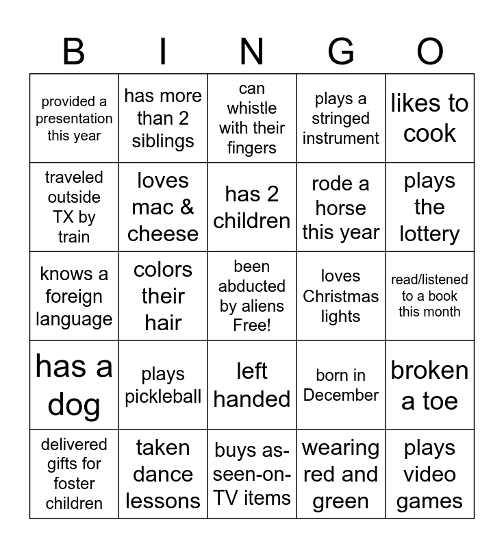 This bingo card has a free space and 49 words: born outside the U.s., plays video games, dressed up for Halloween this year, buys as-seen-on-TV items, plays pickleball, doesn't drink coffee, has more than 2 siblings, been to Europe more than once, traveled outside TX by train, athlete in HS, loves mac & cheese, plays a stringed instrument, broken a toe, born in December, knows nato phonetic alphabet, does yoga, has 2 children, loves Christmas lights, been to 2 music concerts this year, likes to cook, colors their hair, wearing red and green, provided a presentation this year, rode a horse this year, did the hand jive in Bandera, plays the lottery, delivered gifts for foster children, cooked Thanksgiving turkey this year, left handed, has a dog, takes a walk every day, has a balcony, want to a movie this month, attended 4 meetings this week, taken dance lessons, been to a national park, doesn't like cantelope, wears contacts, read/listened to a book this month, joined a Holiday gathering committee, wears crocs, been to New York City, wears toe socks, wearing black shoes, knows a foreign language, can whistle with their fingers, can solve a rubik's cube, loves karaoke and made tamales this year.