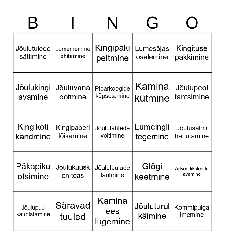 This bingo card has a free space and 24 words: Jõulukuusk on toas, Säravad tuuled, Piparkoogide küpsetamine, Jõulupuu kaunistamine, Kingituse pakkimine, Jõulutulede sättimine, Jõulukingi avamine, Lumememme ehitamine, Lumeingli tegemine, Jõululaulude laulmine, Kamina kütmine, Kingikoti kandmine, Glögi keetmine, Advendikalendri avamine, Jõuluvana ootmine, Jõuluturul käimine, Jõulusalmi harjutamine, Kingipaki peitmine, Jõulupeol tantsimine, Kingipaberi lõikamine, Kommipulga imemine, Päkapiku otsimine, Lumesõjas osalemine and Kamina ees lugemine.