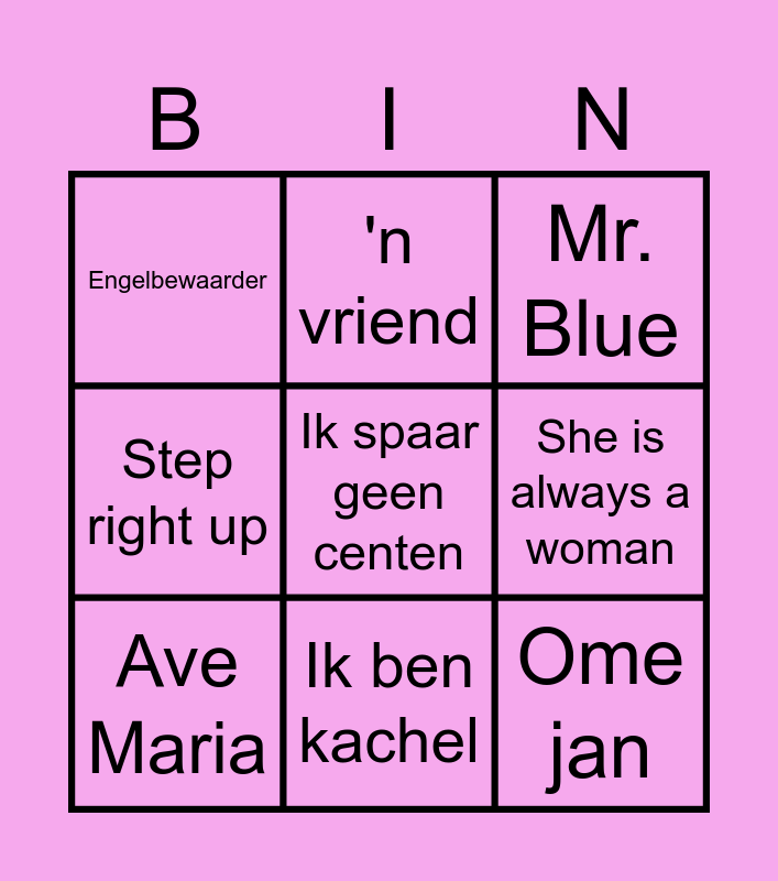 This bingo card has a free space and 8 words: She is always a woman, Mr. Blue, 'n vriend, Ave Maria, Engelbewaarder, Ome jan, Step right up and Ik ben kachel.