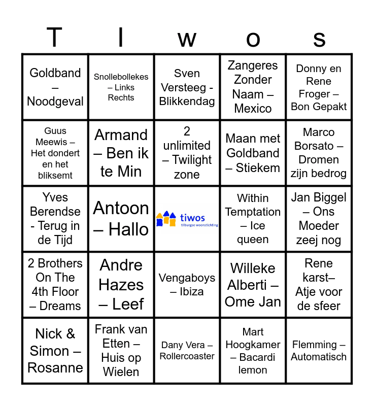 This bingo card has a free space and 49 words: Joost klein – Europapa, Flemming – Automatisch, Paul Elstak – Rainbow In The Sky, Dany Vera – Rollercoaster, Andre Hazes – Leef, Het Goede Doel – België, Snollebollekes – Links Rechts, Toontje lager – Stiekem gedanst, Guus Meewis – Het dondert en het bliksemt, Gers spardoel – Ik neem je mee, Armand – Ben ik te Min, Zangeres Zonder Naam – Mexico, Rene karst– Atje voor de sfeer, Willeke Alberti – Ome Jan, Dolly Dots – Love me just al little bit more, Boudewijn de Groot - Land van maas en Waal, 2 unlimited – Twilight zone, Within Temptation – Ice queen, Marco Schuitmaker – Engelbewaarder, Donny en Rene Froger – Bon Gepakt, Antoon – Hallo, Mart Hoogkamer – Bacardi lemon, Goldband – Noodgeval, Maan met Goldband – Stiekem, K3 – Oya Lele, Marco Borsato – Dromen zijn bedrog, Nick & Simon – Rosanne, Linda Roos en jesica – Ademnood, Vengaboys – Ibiza, 2 Brothers On The 4th Floor – Dreams, Shocking Blue – Venus, Wesley Bronkhorst – Amalia, De Dijk - Ik kan t niet alleen, Jango Wagner – Kali, Frank van Etten – Huis op Wielen, Jan Smit – Als de morgen is gekomen, Donnie Chantal jansen - Schultenbrau, Anouk Nobody’s Wife, Jan Biggel – Ons Moeder zeej nog, Golden Earring - Radar Love, Youp van t Hek - Flappie, Bert en Ernie - Ik ben een Kerstbal, Andre Hazes - Eenzame Kerst, Guus Meeuwis - Vrolijk kerstfeest Allemaal, Yves Berendse - Terug in de Tijd, Sven Versteeg - Blikkendag, Effe Serieus - Baila de Gasolina, JanSmit - Als de morgen is gekomen and Gerard Joling - Maak me gek!.