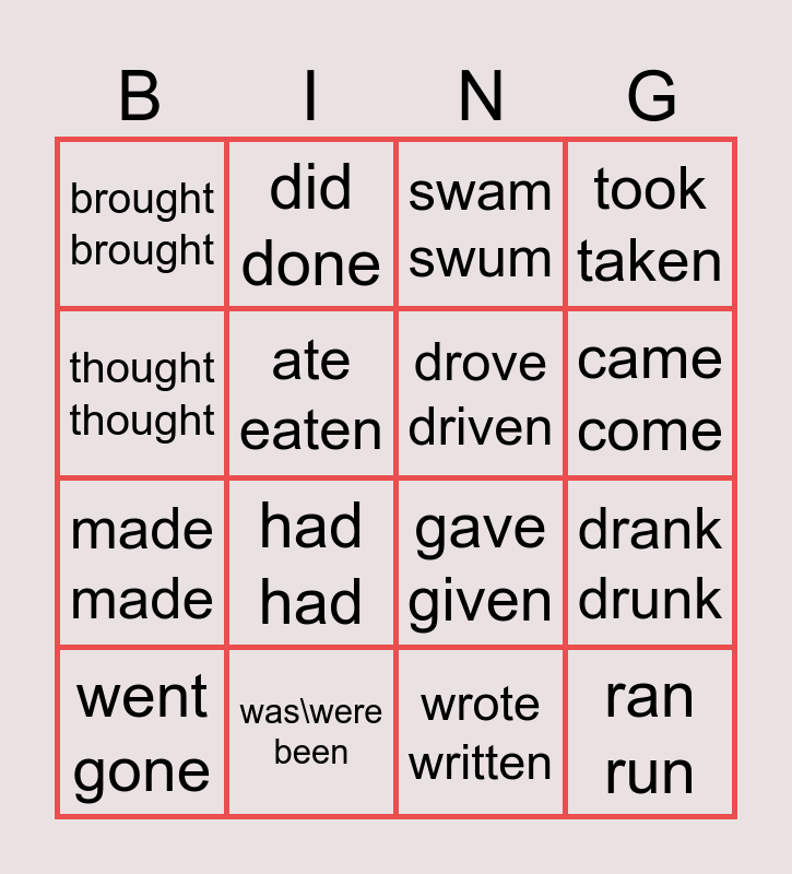 This bingo card has 16 words: was\were been, drank drunk, swam swum, brought brought, made made, did done, gave given, wrote written, thought thought, ate eaten, went gone, took taken, had had, came come, drove driven and ran run.