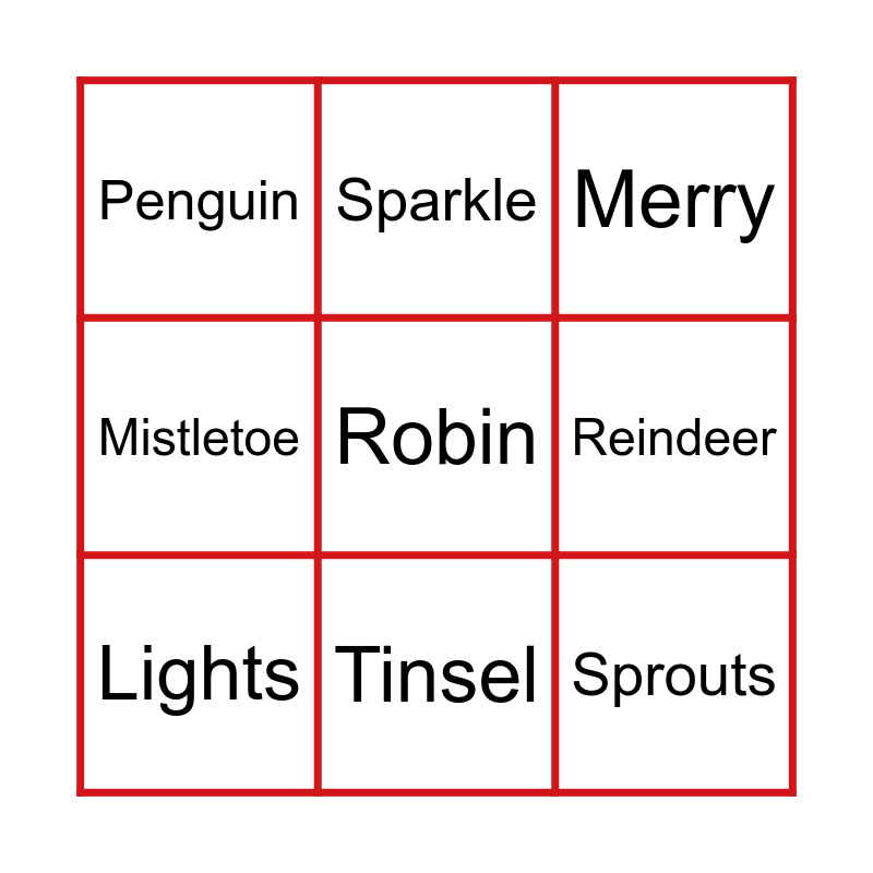 This bingo card has a free space and 46 words: Holiday, Santa, Sleigh, Trees, Snow, Donkey, Sparkle, Presents, Reindeer, Stars, Lights, Mistletoe, Shopping, Turkey, Roast Potatoes, Gravy, Tinsel, Chocolate, Christmas, Sprouts, Festive, Jumper, Penguin, Yuletide, Mulled Wine, Krampus, Elves, Die Hard, Love Actually, Elf, North Pole, Mrs Claus, Pumpkin Pie, Cinnamon, Gingerbread man, Candy Cane, Eggnog, Baubles, Carols, Chestnuts, Jolly, Merry, Stockings, Candle, Holly and Nutcracker.