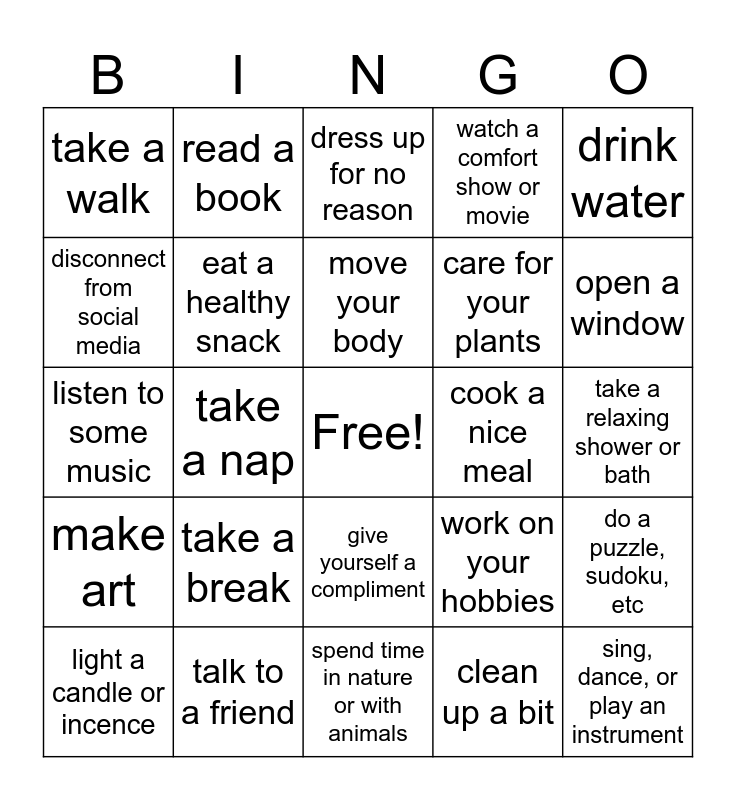 This bingo card has a free space and 24 words: take a break, talk to a friend, move your body, light a candle or incence, drink water, take a walk, disconnect from social media, read a book, cook a nice meal, give yourself a compliment, care for your plants, listen to some music, work on your hobbies, do a puzzle, sudoku, etc, eat a healthy snack, clean up a bit, take a relaxing shower or bath, dress up for no reason, open a window, take a nap, sing, dance, or play an instrument, make art, watch a comfort show or movie and spend time in nature or with animals.