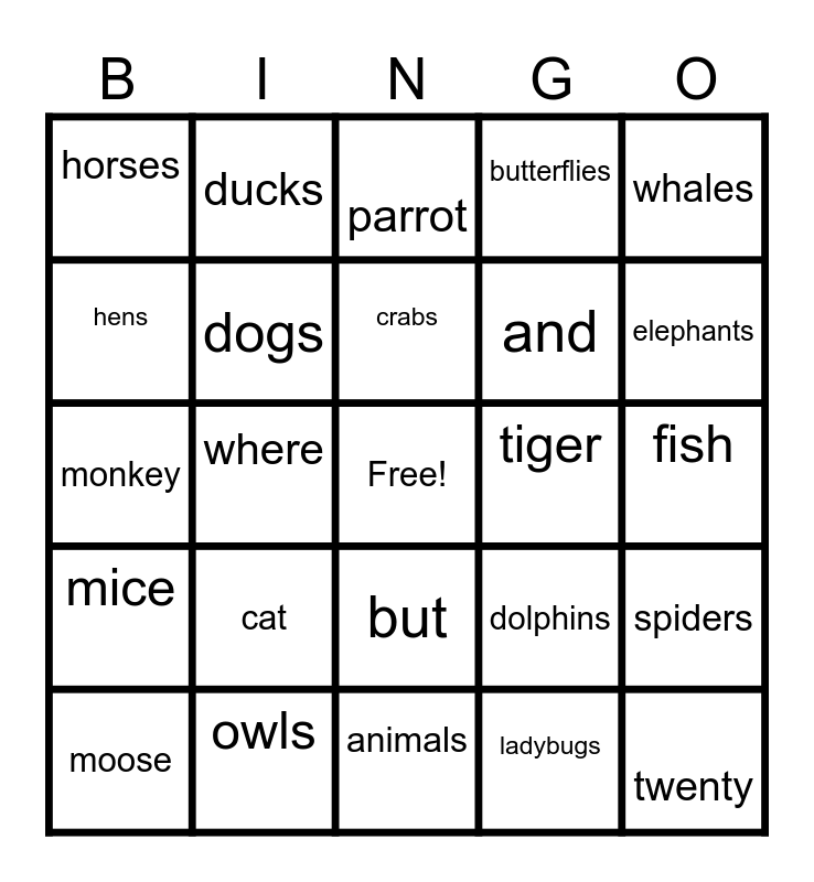 This bingo card has a free space and 24 words: moose, cat, crabs, ladybugs, whales, horses, ducks, parrot, tiger, fish, monkey, dogs, dolphins, spiders, hens, owls, animals, butterflies, elephants, mice, where, but, and and twenty.