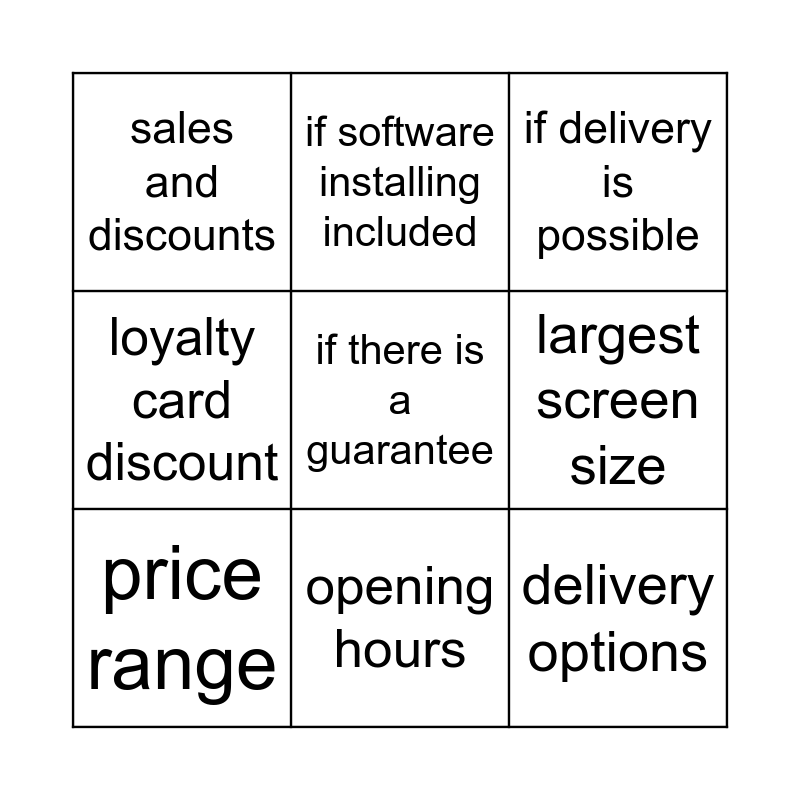 This bingo card has 15 words: location, models available, if delivery is possible, sales and discounts, opening hours, if there is a guarantee, length of sale, available brands, largest screen size, delivery options, payment options, loyalty card discount, price range, if software installing included and delivery charges.