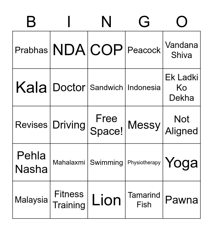 This bingo card has a free space and 24 words: Malaysia, Mahalaxmi, Sandwich, Tamarind Fish, Vandana Shiva, Prabhas, NDA, COP, Messy, Not Aligned, Revises, Doctor, Physiotherapy, Yoga, Kala, Fitness Training, Lion, Peacock, Ek Ladki Ko Dekha, Pehla Nasha, Driving, Swimming, Indonesia and Pawna.