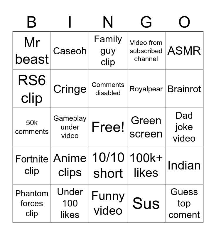 This bingo card has a free space and 24 words: Anime clips, Under 100 likes, Comments disabled, Phantom forces clip, ASMR, Mr beast, RS6 clip, Caseoh, Green screen, 10/10 short, Royalpear, 50k comments, 100k+ likes, Indian, Cringe, Sus, Dad joke video, Family guy clip, Brainrot, Gameplay under video, Guess top coment, Fortnite clip, Video from subscribed channel and Funny video.
