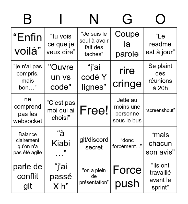 This bingo card has a free space and 24 words: “à Kiabi …”, “j'ai passé X h”, “j’ai codé Y lignes”, parle de conflit git, “Le readme est à jour”, “Enfin voilà”, "je n'ai pas compris, mais bon…", “tu vois ce que je veux dire”, Jette au moins une personne sous le bus, git/discord secret, rire cringe, ne comprend pas les websocket, “donc forcément...”, “mais chacun son avis", "Ouvre un vs code", Force push, “screenshout”, "Je suis le seul à avoir fait des taches", Se plaint des réunions à 20h, "C’est pas moi qui ai choisi”, "ils ont travaillé avant le sprint", Balance clairement qu’on n'a pas été agile, Coupe la parole and "on a plein de présentation”.