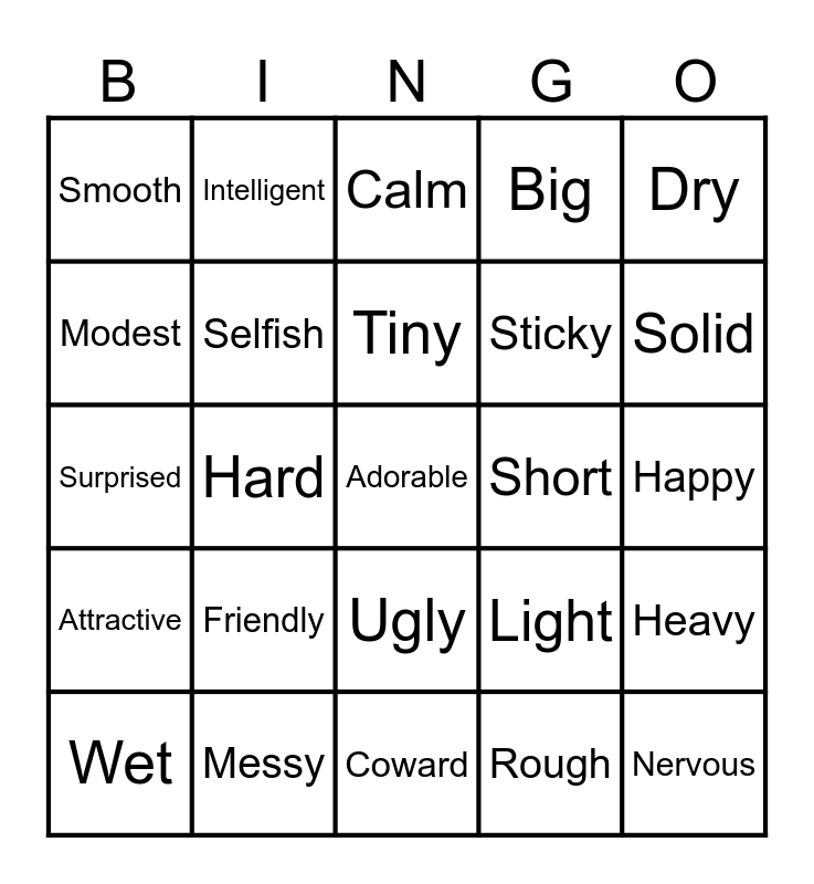 This bingo card has 47 words: Free!, Adorable, Brave, Coward, Friendly, Hard-working, Intelligent, Kind, Modest, Responsible, Selfish, Big, Heavy, Light, Small, Tall, Tiny, Short, Soft, Dry, Hard, Rough, Smooth, Sticky, Slippery, Solid, Wet, Beautiful, Ugly, Attractive, Gorgeous, Stylish, Charming, Cute, Handsome, Messy, Happy, Sad, Angry, Excited, Nervous, Calm, Surprised, Afraid, Confident, Jealous and Grateful.