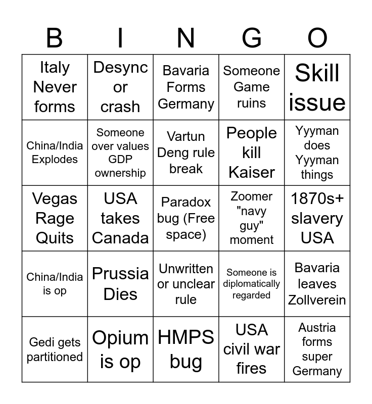 This bingo card has a free space and 24 words: Prussia Dies, Opium is op, Vartun Deng rule break, Gedi gets partitioned, Skill issue, Italy Never forms, China/India Explodes, Desync or crash, Zoomer "navy guy" moment, Unwritten or unclear rule, People kill Kaiser, Vegas Rage Quits, Someone is diplomatically regarded, Bavaria leaves Zollverein, Someone over values GDP ownership, USA civil war fires, 1870s+ slavery USA, Bavaria Forms Germany, Yyyman does Yyyman things, USA takes Canada, Austria forms super Germany, China/India is op, Someone Game ruins and HMPS bug.