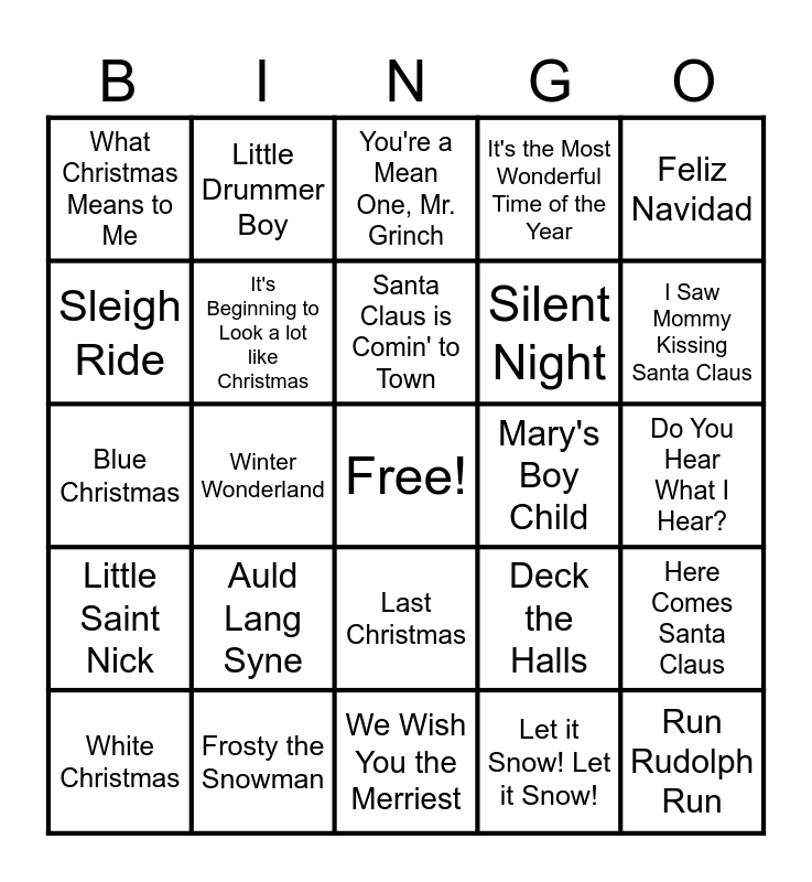 This bingo card has a free space and 35 words: Rockin' Around the Christmas Tree, All I Want for Christmas is You, Jingle Bell Rock, It's Beginning to Look a lot like Christmas, Last Christmas, It's the Most Wonderful Time of the Year, Sleigh Ride, Snowman, Santa Claus is Comin' to Town, Christmas (Baby Please Come Home), Blue Christmas, Feliz Navidad, A Holly Jolly Christmas, Christmas Time, What Christmas Means to Me, Mary's Boy Child, Let it Snow! Let it Snow!, Winter Wonderland, Little Saint Nick, Run Rudolph Run, Deck the Halls, White Christmas, Here Comes Santa Claus, Frosty the Snowman, You're a Mean One, Mr. Grinch, I Saw Mommy Kissing Santa Claus, Rudolph the Red-nosed Reindeer, Jingle Bells, Silent Night, Do You Hear What I Hear?, Baby, It's Cold Outside, We Wish You the Merriest, Auld Lang Syne, Little Drummer Boy and I'll Be Home for Christmas.