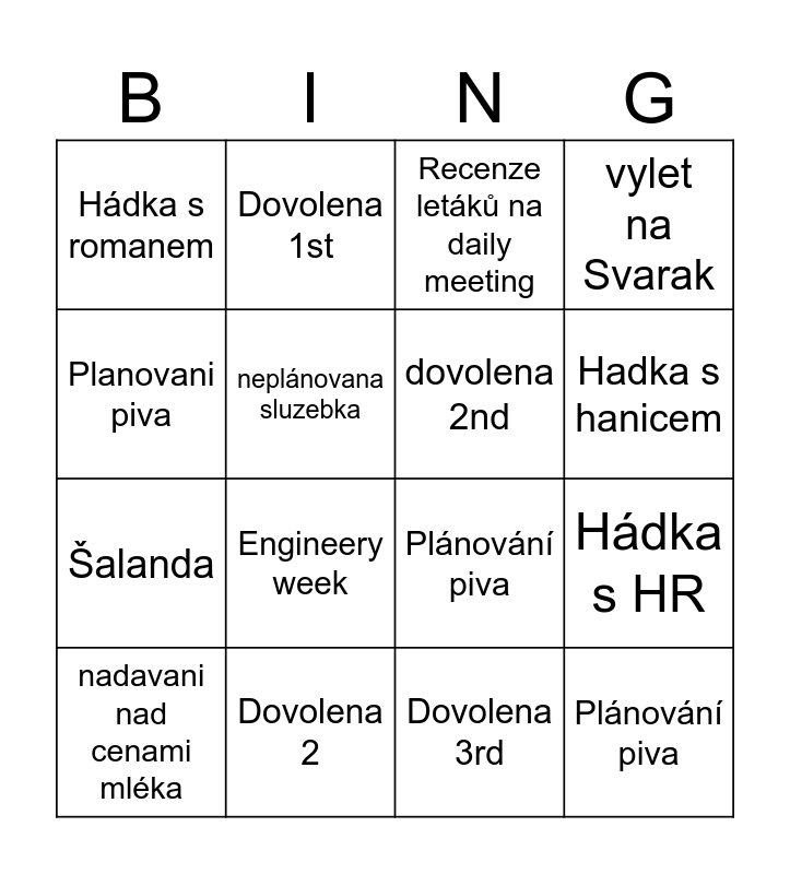 This bingo card has 18 words: Engineery week, Plánování piva, Recenze letáků na daily meeting, Hádka s romanem, Plánování piva, vylet na Svarak, nadavani nad cenami mléka, Dovolena 1st, Hadka s hanicem, Šalanda, Dovolena 3rd, Planovani piva, Hádka s HR, neplánovana sluzebka, dovolena 2nd, Plánování piva, Dovolena 2 and Posezení na šalandě.